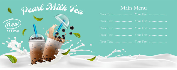 Bubble Milk Tea Menu Ads With Delicious Tapioca And Pearl Pouring
